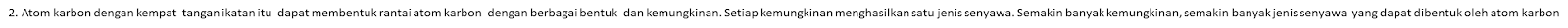 2. Atom karbon dengan kempat tangan ikatan itu dapat membentuk rantai atom karbon dengan berbagai bentuk dan kemungkinan. Setiap kemungkinan menghasilkan satu jenis senyawa. Semakin banyak kemungkinan, semakin banyak jenis senyawa yang dapat dibentuk oleh atom karbon.